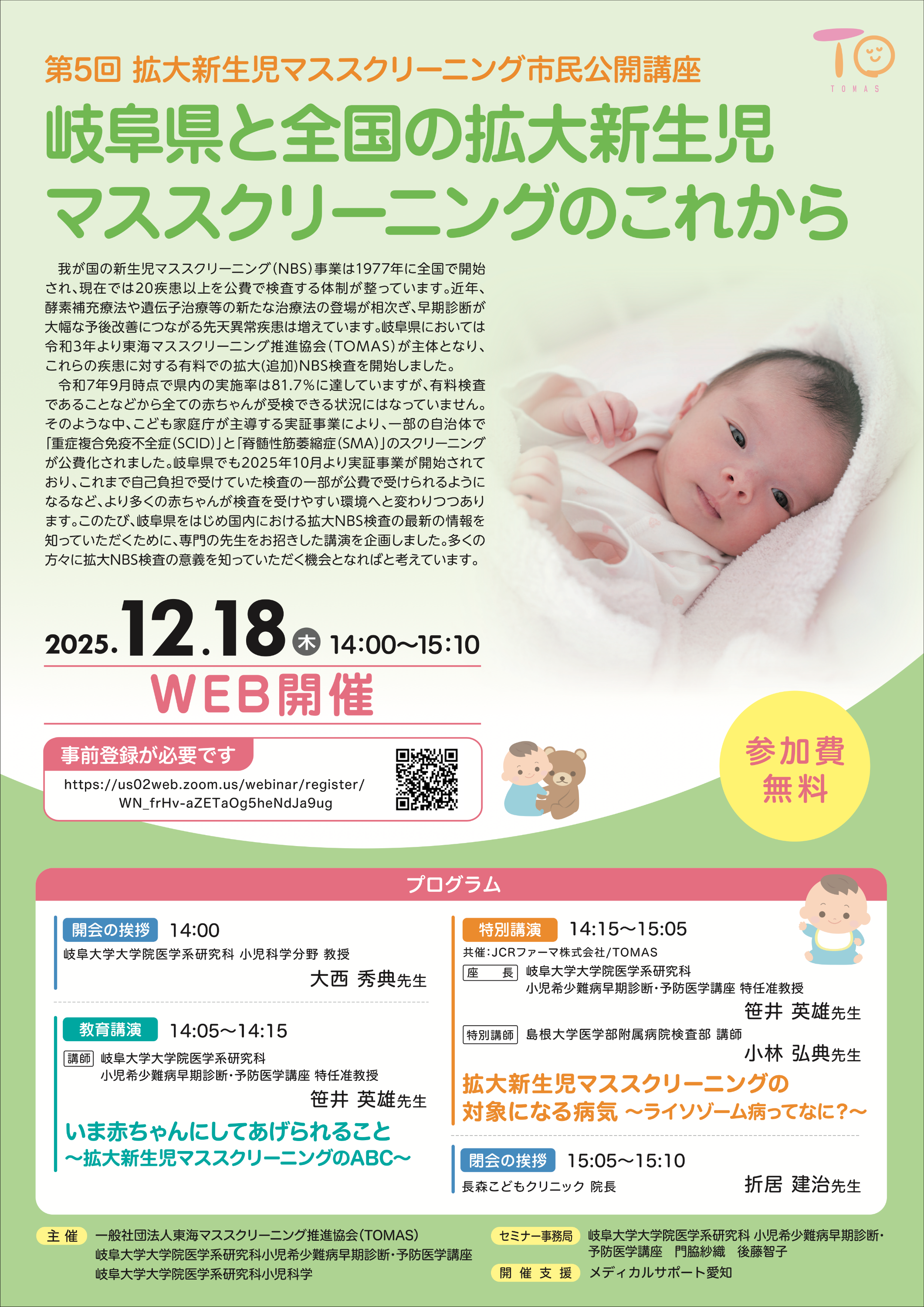 岐阜県で実施している拡大新生児マススクリーニング検査の現状と課題に加えて、国内における最新の状況を知っていただくために専門の先生をお招きして、市民公開講座を企画しました。(TOMAS、岐阜大学 希少難病寄附講座、岐阜大学 小児科による共催形式になります。)