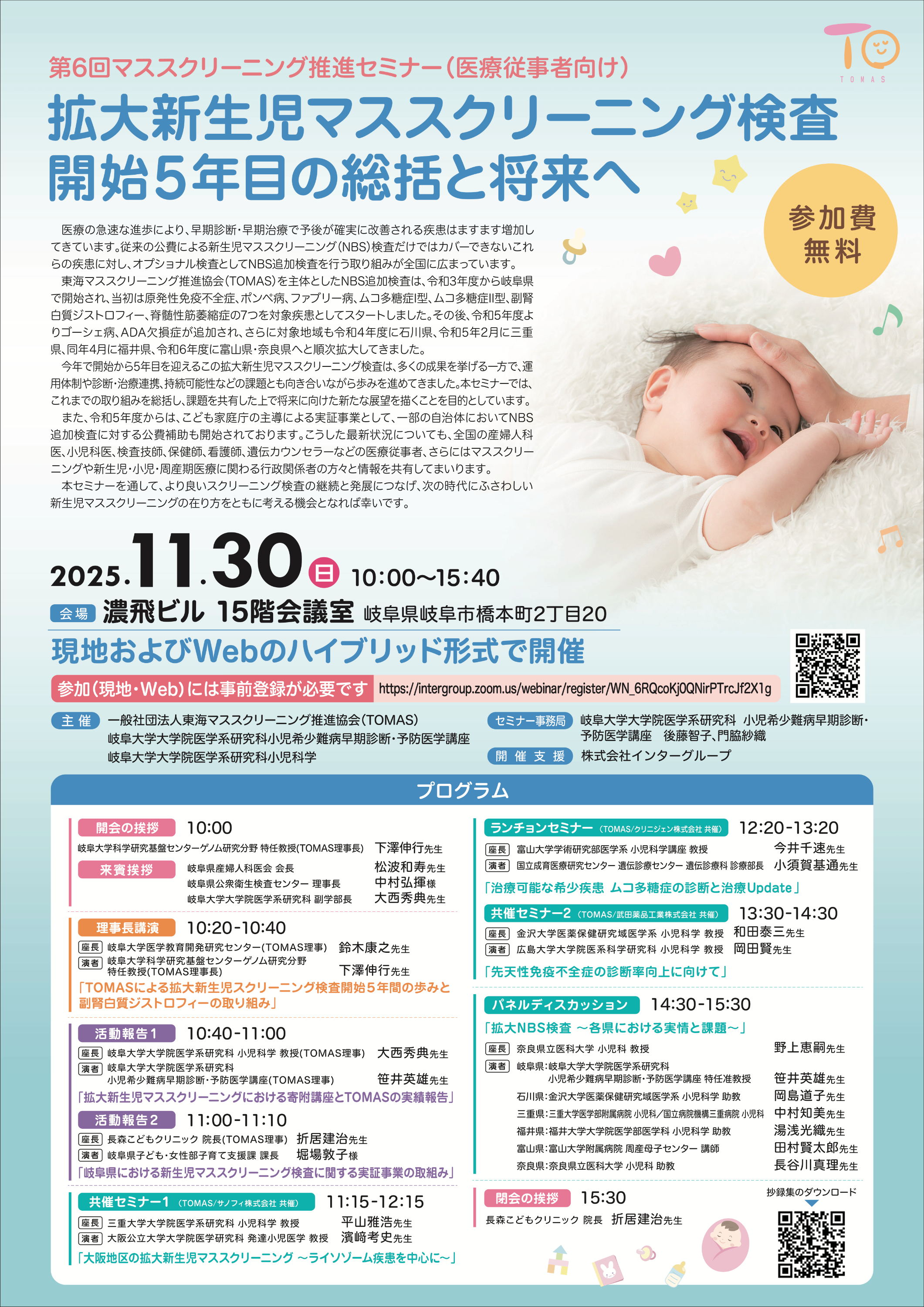 今回、NBSや新生児・小児・周産期医療に関係する全国の医療従事者や行政関係の方々を対象に、参加6県による合同セミナーを企画しました。(TOMAS、寄附講座、小児科による共催形式になります。)こども家庭庁の動きや全国の状況を知り、今後のより良いスクリーニング検査の継続、発展につながる機会になればと考えています。